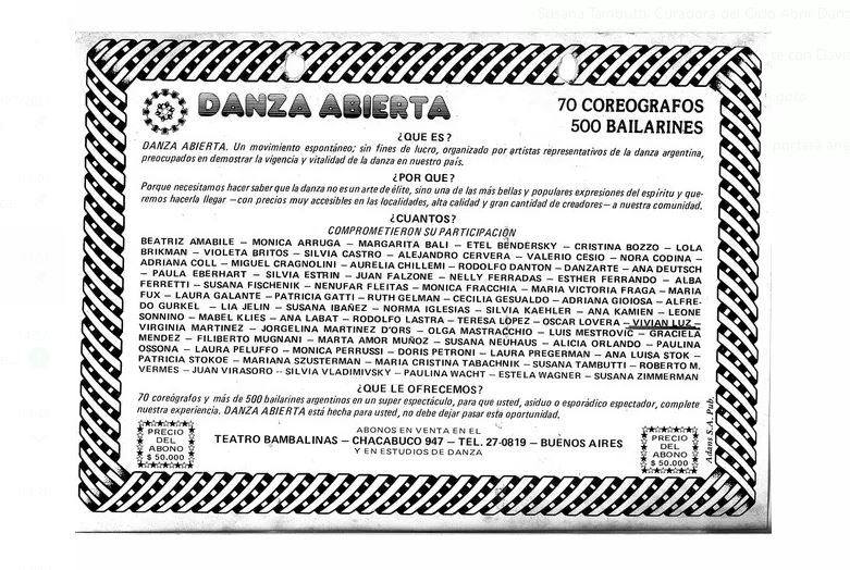 "Danza Abierta, en esta disciplina que es la danza, es diferente al ciclo Teatro Abierto en el sentido de que nuestra disciplina recién en las últimas décadas estuvo más politizada. Lo interesante es ver cómo aparecían en las coreografías ese fondo oscuro, quizás de manera inconsciente", detalló Tambutti en diálogo con Radio Provincia.