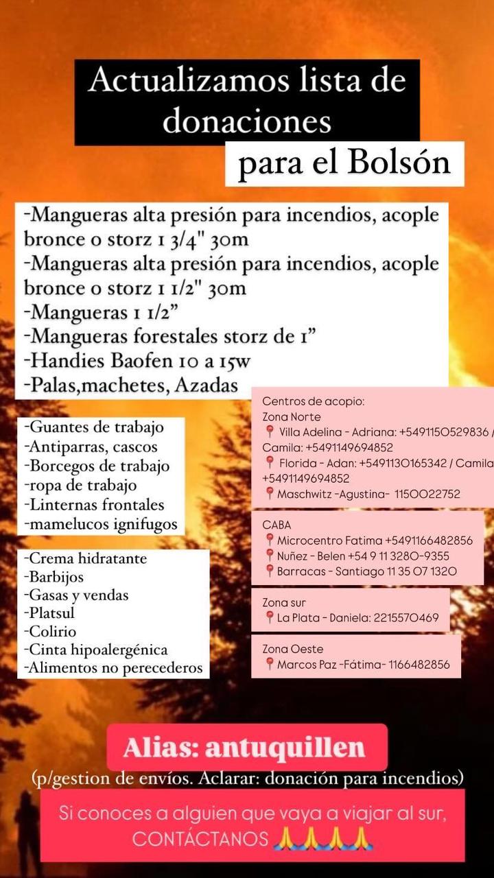 “Estamos enfocados en colaborar en la lucha contra los incendios porque los fuegos siguen activos y siguen apareciendo nuevos focos. Asique estamos pidiendo mangueras, hachas, machetes…Y también recolectamos cremas hidratantes, barbijos, Platsul, Colirio, guantes de trabajo, botines...”, detalló y aclaró que la entidad pone a disposición el alias “antuquillen”, para que las personas puedan acercar sus donaciones para “poder comprar todos estos elementos que son muy costosos”.