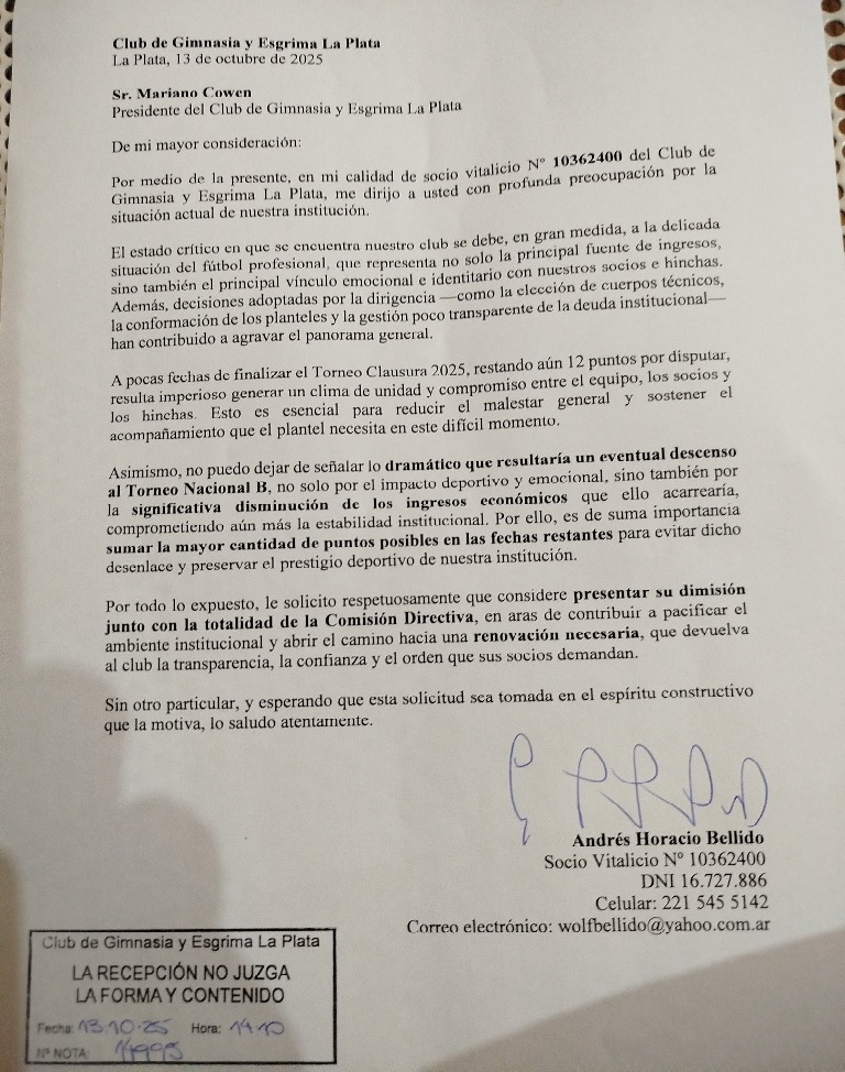 “Esto surgió porque se siente mucha impotencia, uno ve que se está desangrando el club y el mandato del actual presidente es nefasto en todo sentido, no han pegado una. En esta situación me puse a ver qué podía hacer, ayer me levanté y comencé a escribir la nota y la presenté por mesa de entrada”.