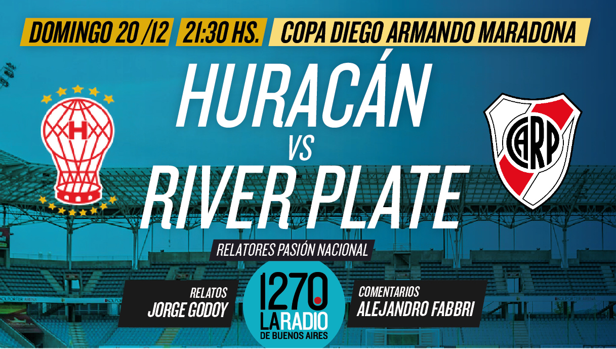 Más tarde, desde Parque Patricios a las 21:30hs juegan Huracán y River, con relatos de Jorge Godoy y comentarios de Alejandro Fabbri, a cargo de Relatores Pasión Nacional.