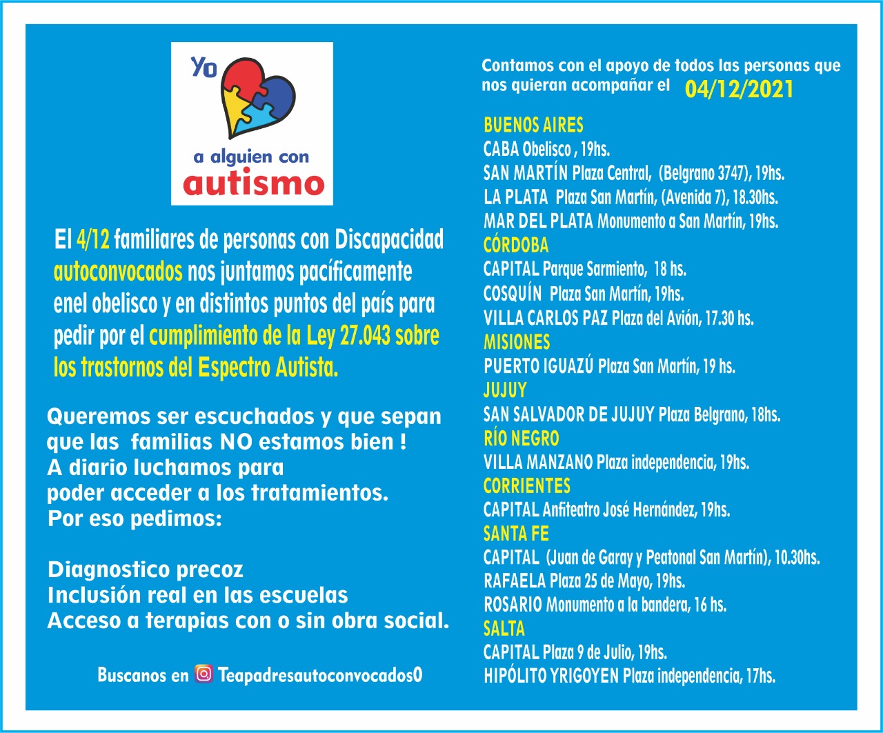 Padres y madres de niños con autismo se reúnen en diferentes puntos del país para pedir que se termine de reglamentar y se aplique la Ley de Abordaje Integral del Autismo.