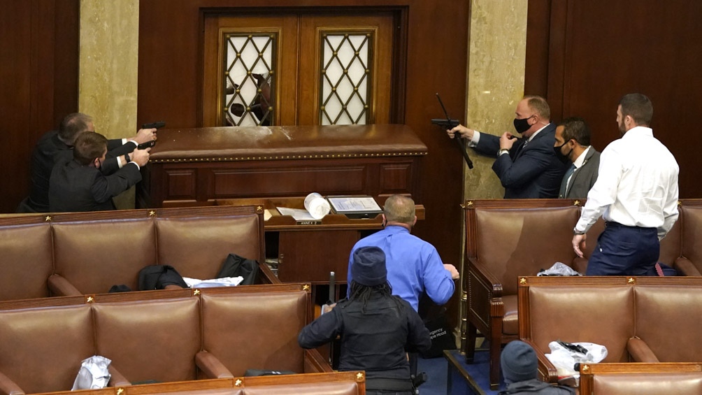 La cadena CNN mostró una imagen del interior del recinto de la Cámara de Representantes con una ventana rota y un grupo de fuerzas de seguridad del Capitolio apuntando sus armas a un presunto manifestante que logró ingresar al edificio del Congreso.