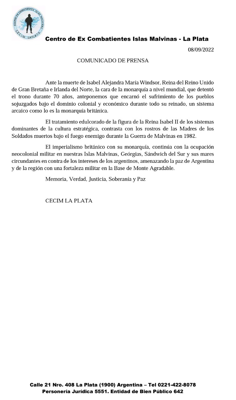 En ese sentido, indicó que sólo basta pensar “en cuantos conflictos mundiales siguen participando las fuerzas armadas británicas”. El excombatiente dijo que la visión liviana sobre la figura de la reina “contrasta con el rostro de las madres que preguntaban por sus hijos muertos por el enemigo británico” cuando terminó la guerra de Malvinas.