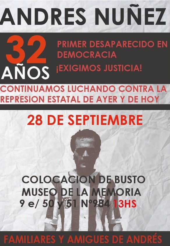 Organizaciones de Derechos Humanos, amigos y familiares de Andrés Nuñez realizan la colocación de un busto en memoria del joven albañil que fuera detenido, torturado e incinerado por policías bonaerenses un 28 de septiembre de 1990.